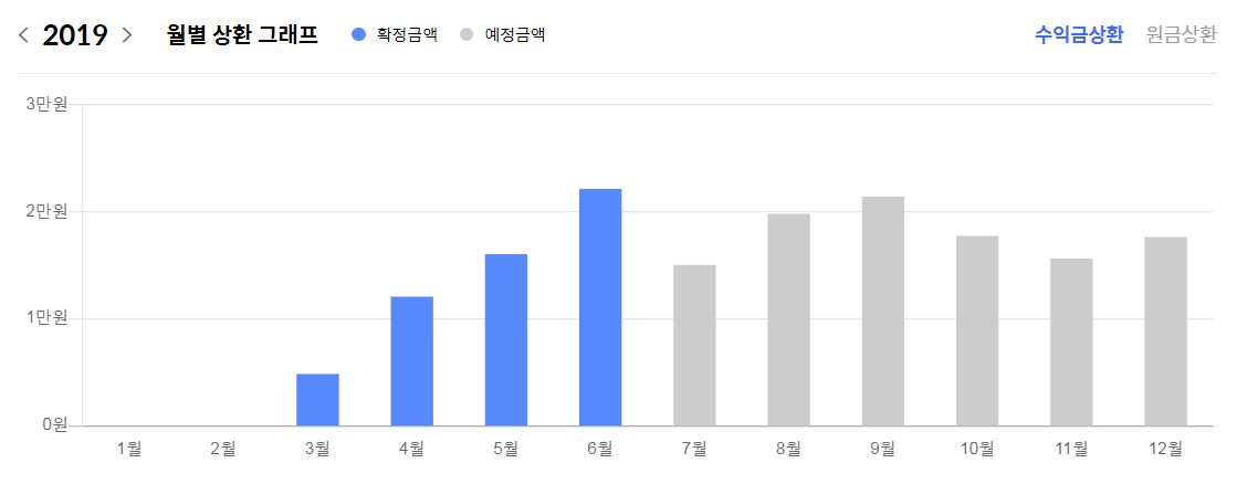 50만원으로 시작해서 투자금을 점차 늘렸고, 지금은 매달 200~300만원 사이의 금액으로 투자금을 유지하고 있다. 비록 소액이지만 수익은 아래 그래프에서 볼 수 있듯이 매달 1.5만원~2만원 이상, 세전 12%, 세후 9% 정도의 수익을 얻고 있다.